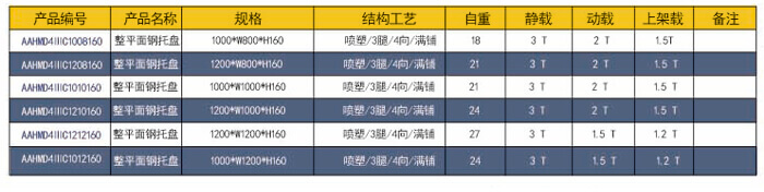 四向三腿——整平面鋼托盤 技術(shù)參數(shù)說明: 產(chǎn)品編號(hào): AAHMD4ⅢH1210160 產(chǎn)品名稱: 整平板川字鋼托盤 產(chǎn)品規(guī)格: 1200*1000*160 產(chǎn)品重量: 24kg 產(chǎn)品靜載: 4000KG(均勻載重) 產(chǎn)品動(dòng)載: 2000KG(均勻載重) 產(chǎn)品上架: 1500KG(均勻載重) 防銹工藝: 靜電沙紋噴塑 主要用途: 倉庫、車間周轉(zhuǎn)、物流倉儲(chǔ)