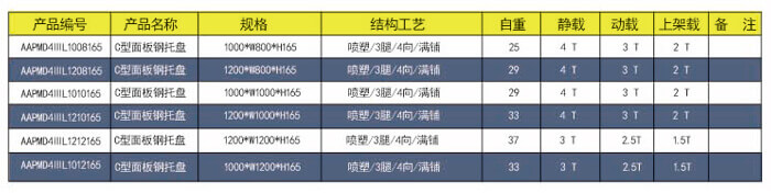 四向三腿——C型面板鋼托盤 技術(shù)參數(shù)說明: 產(chǎn)品編號: AAPMD4ⅢL1210165 產(chǎn)品規(guī)格: 1200*1000*165 產(chǎn)品自重: 33kg 防銹工藝: 靜電沙紋噴塑 產(chǎn)品靜載: 3000KG(均勻載重) 產(chǎn)品動(dòng)載: 2500KG(均勻載重) 產(chǎn)品上架: 1500KG(均勻載重) 主要用途: 倉庫、車間周轉(zhuǎn)、物流倉儲